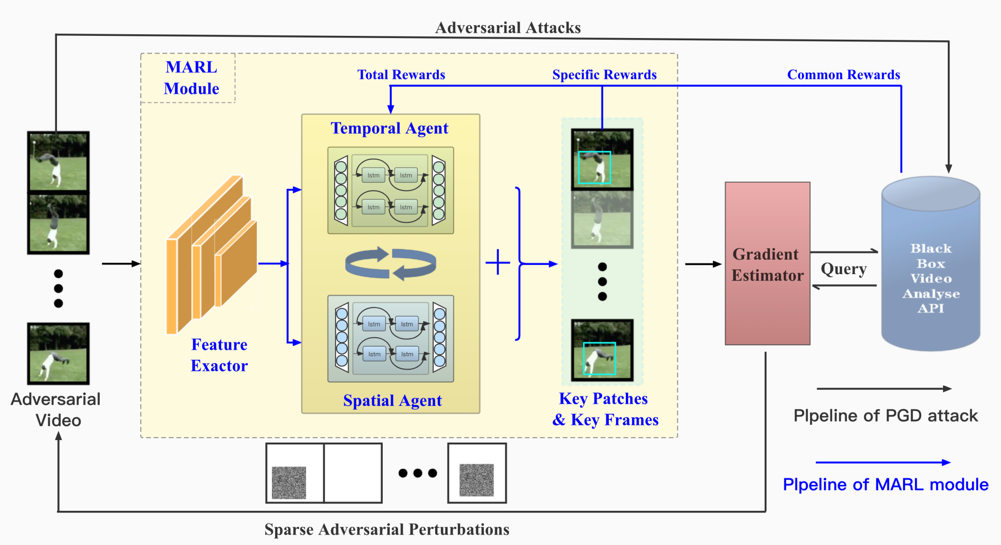 该论文针对高维视频数据带来的视频智能模型漏洞挖掘效率低下问题,提出使用多智能体强化学习框架同时在视频数据空间维度和时间维度进行降维处理,从而在黑盒条件下对视频智能模型的梯度进行高效准确的估计,最终实现对视频智能模型的快速漏洞挖掘。相比现有最优方法,该方法可在漏洞挖掘准确率提高5%的情况下,时间复杂度降低10%。
