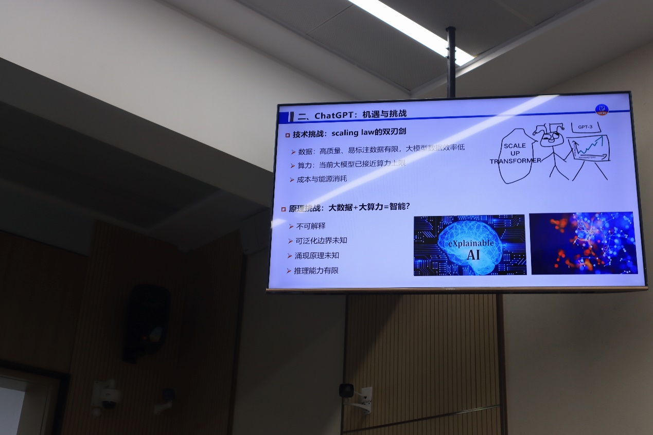 王鑫老师讲解了人工智能领域面临的机遇与挑战。他特别提到了最新的大模型ChatGPT,并指出,该模型具备了学习能力和智能涌现的雏形,但也面临着数据质量、算力、原理和安全等方面的挑战。他呼吁同学们勇于直面这些挑战,以实现人工智能在各个领域更广泛的应用。