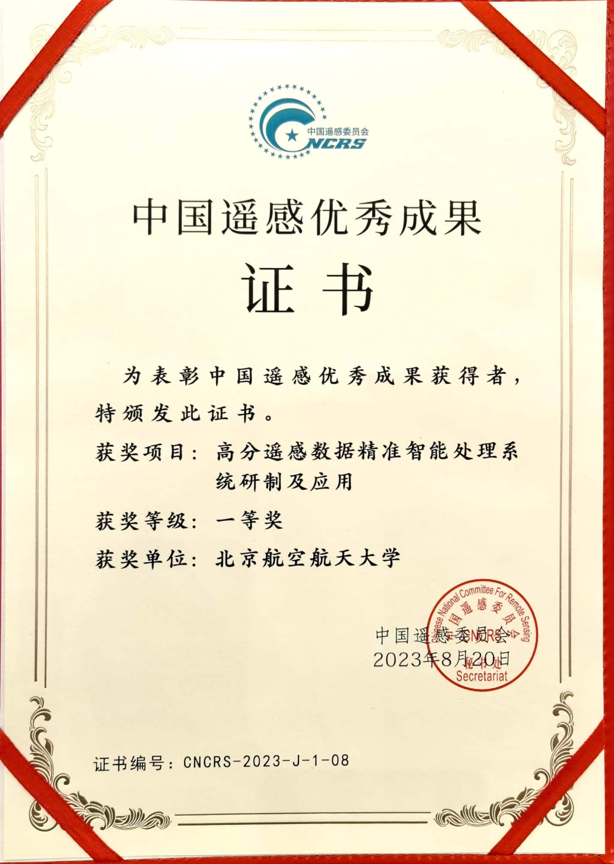 图2 中国遥感优秀成果获奖证书