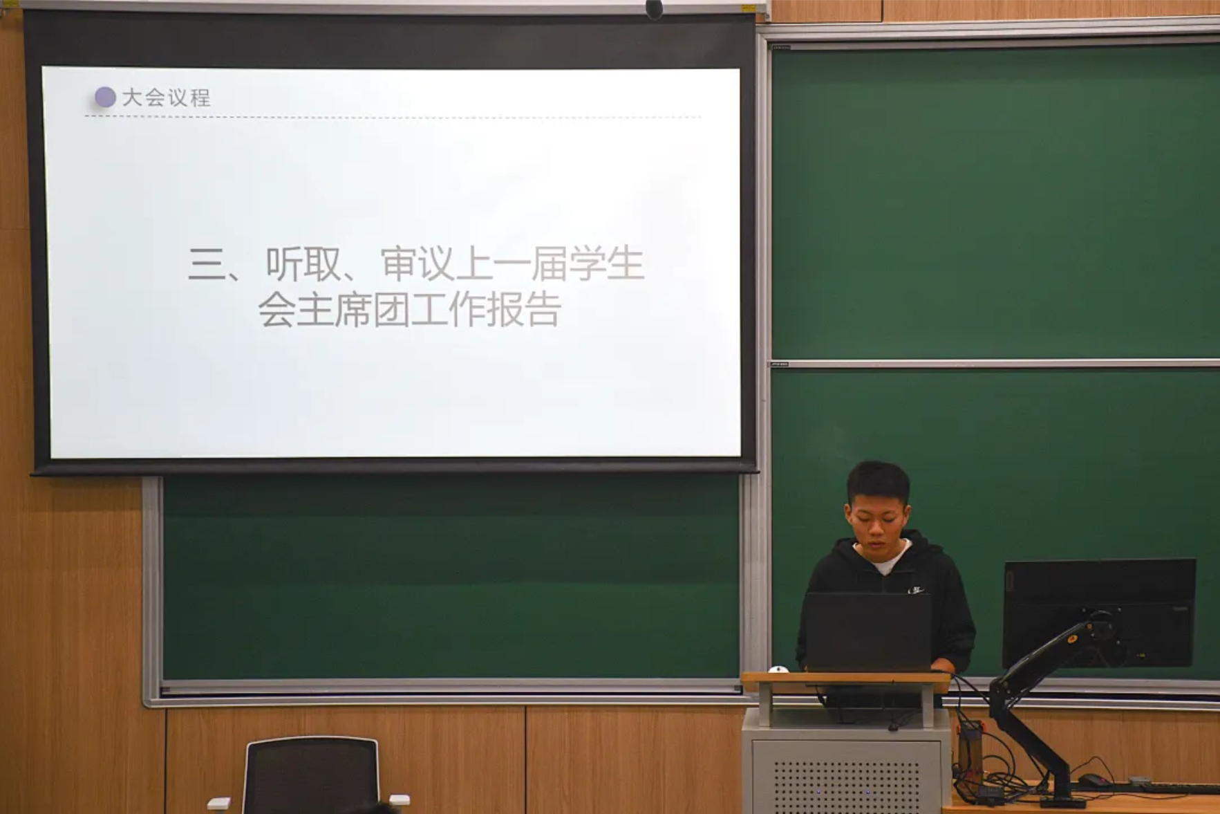 葛海鑫同学作为第一届员工会主席团成员对上一届员工会主席团的工作进行了工作总结报告。肯定了上一届员工会在“加强与各年级班委的合作联动、打造全研究院共享的学习资源共享平台、丰富研究院新媒体宣传渠道、加强志愿服务于社会实践工作、开展学海领航学院知识活动、开展全民运动健康同行系列活动、组织阅读成长与交流活动”等方面所作出的卓越贡献。同时也指出实践过程中存在“学院支持帮助力度不够、信息传达不及时、权益维护渠道单一”的不足,需要我们去逐一改进。最后,葛海鑫同学真切地表达了对人工智能研究院全体人员的大力支持的感激,以及对员工会未来蓬勃发展的展望。