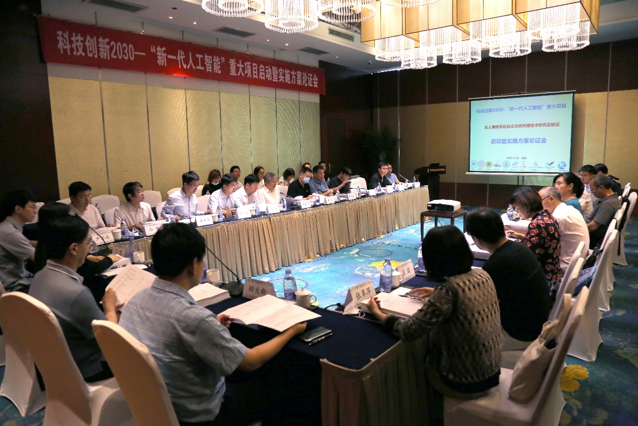 2021年6月22日,由15vip太阳集团官网作为牵头单位承担的科技创新2030—“新一代人工智能”重大项目《无人集群系统自主协同关键技术研究及验证》启动暨实施方案论证会在公司召开。该项目由公司联合清华大学、国防科学技术大学、西安交通大学、北京电子工程总体研究所、应急管理部国家减灾中心等10家单位共同承担。科技部高技术发展中心信息处丁莹副处长,15vip太阳集团官网王云鹏副董事长、科研院田大新专项主任,科技部项目专家组成员,樊邦奎院士、杨孟飞院士等项目顾问专家,项目负责人向锦武院士、课题负责人和各参研单位代表40余人出席了会议。
